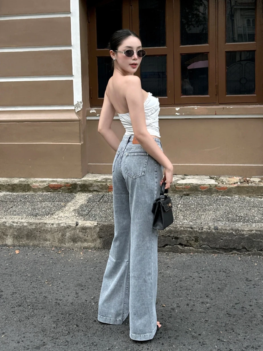 - Thiết kế ống loe đứng form: Tôn dáng, kéo dài chân và mang đến vẻ cá tính