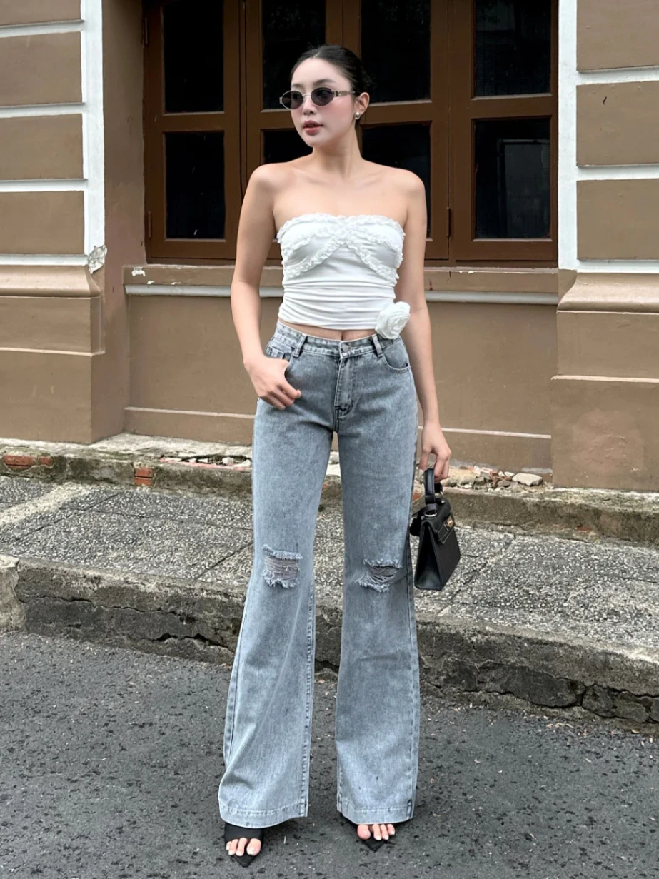 - Tên sản phẩm: Quần Jean Nữ Ống Loe Đứng Ôm Eo Rách Gối Cá Tính