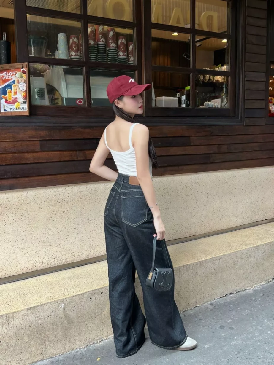 - Kiểu dáng: Quần jean ống suông rộng, lưng cao, chi tiết chỉ nổi