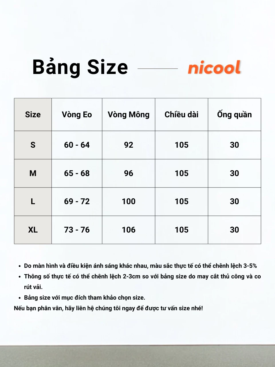 Lưu ý: Bảng size có thể có sai số 2-3cm tùy vào độ co giãn của vải. Còn phân vân? Liên hệ ngay với NICOOL để được tư vấn size chuẩn nhất!