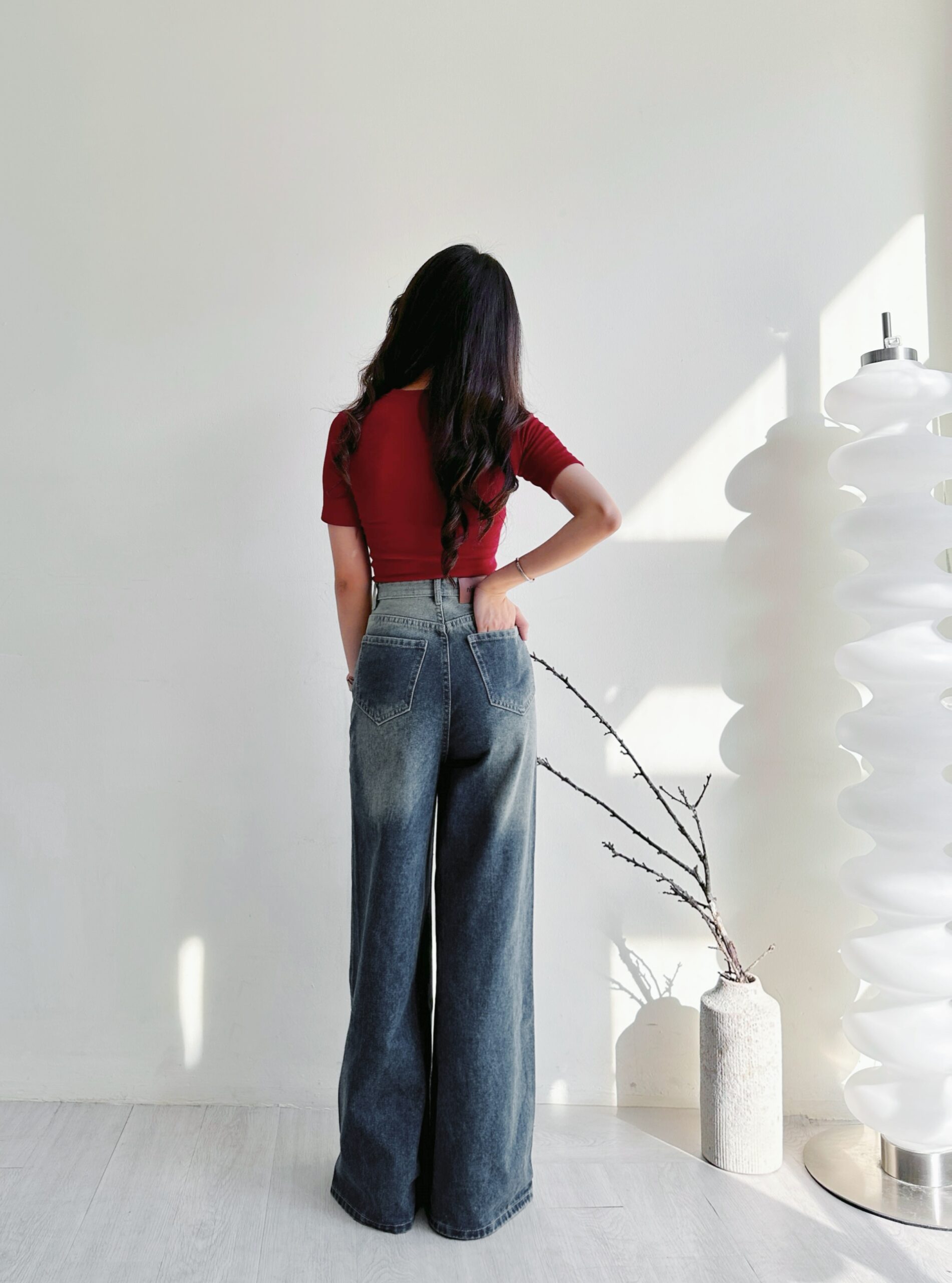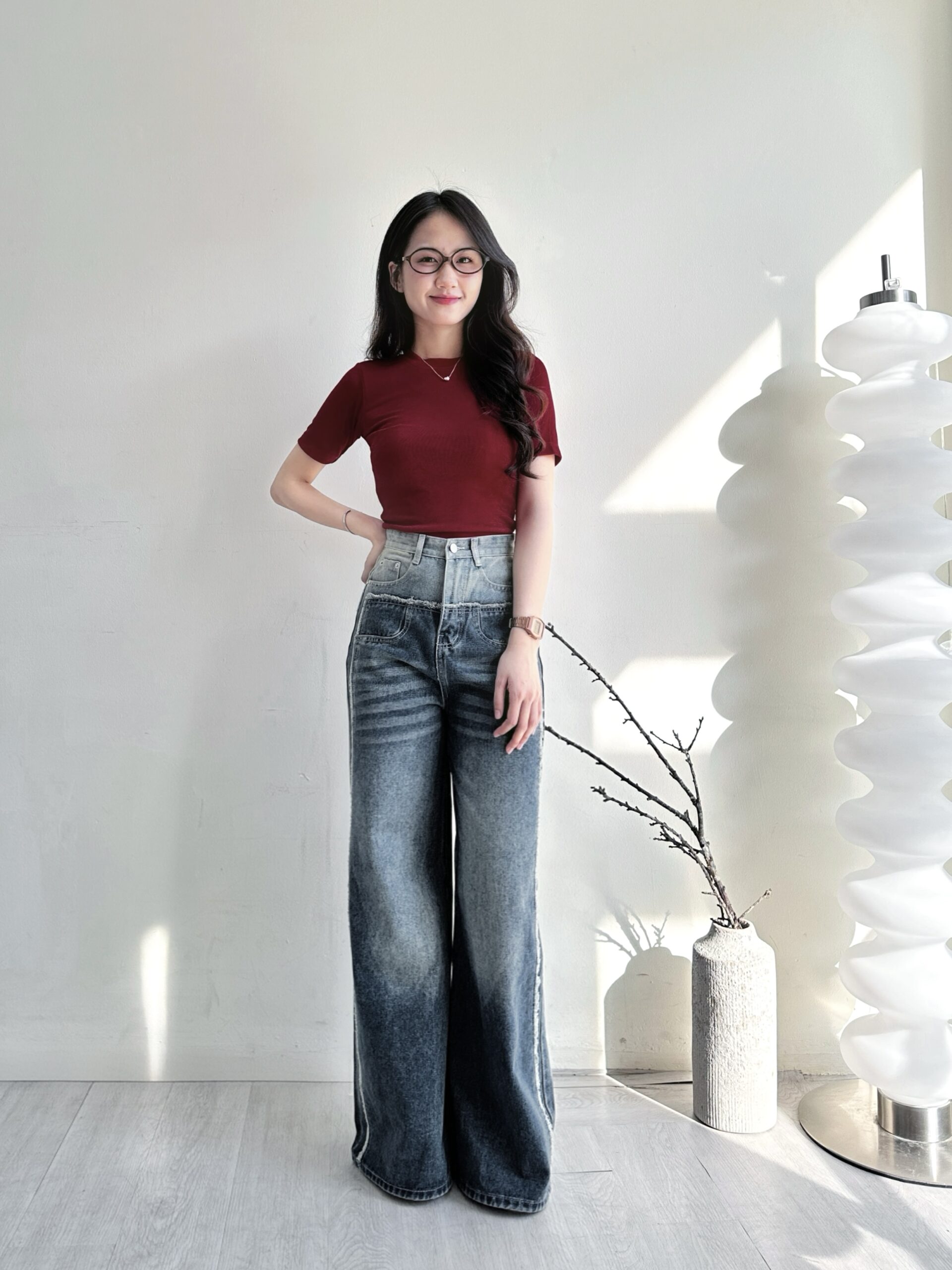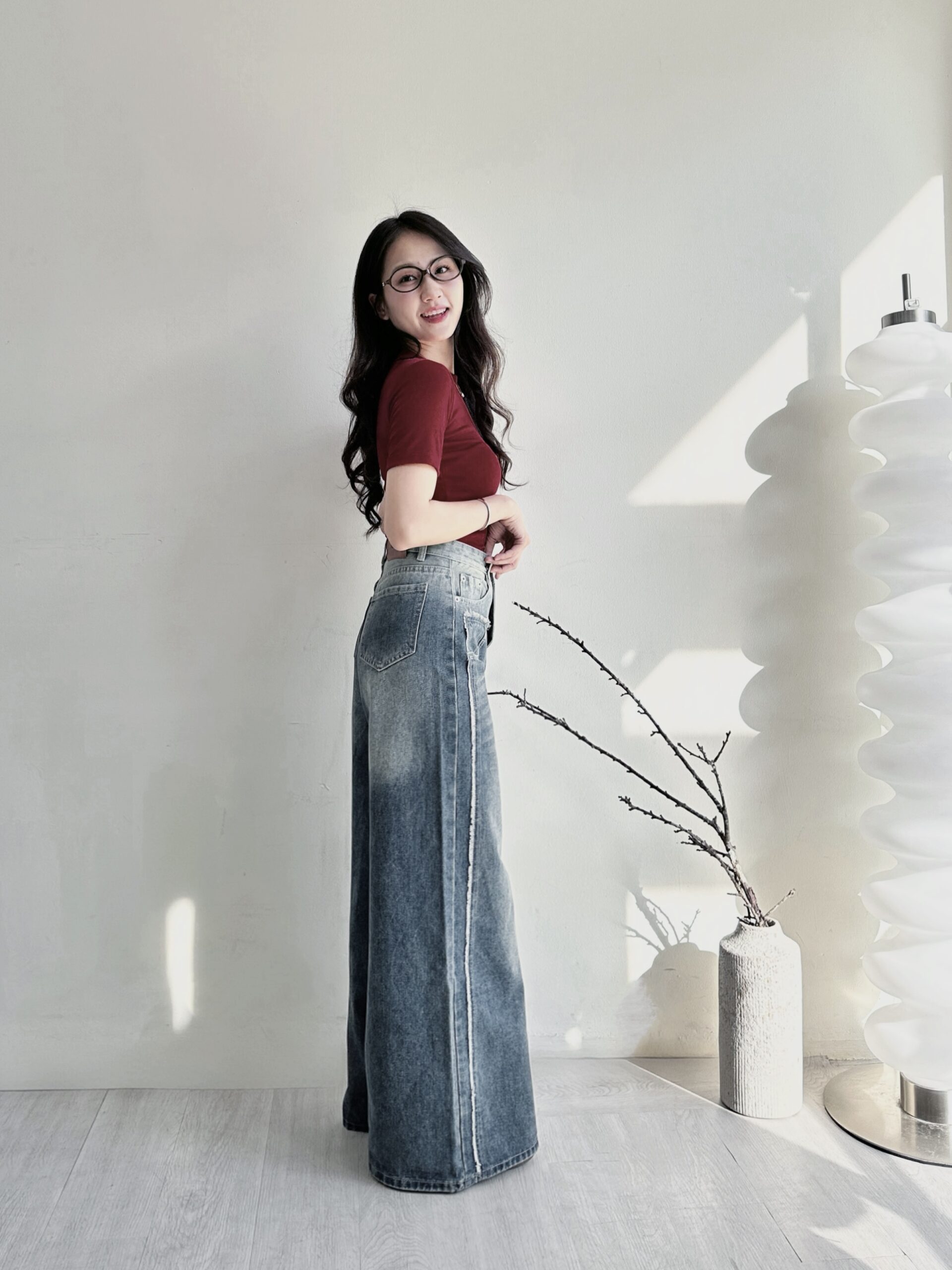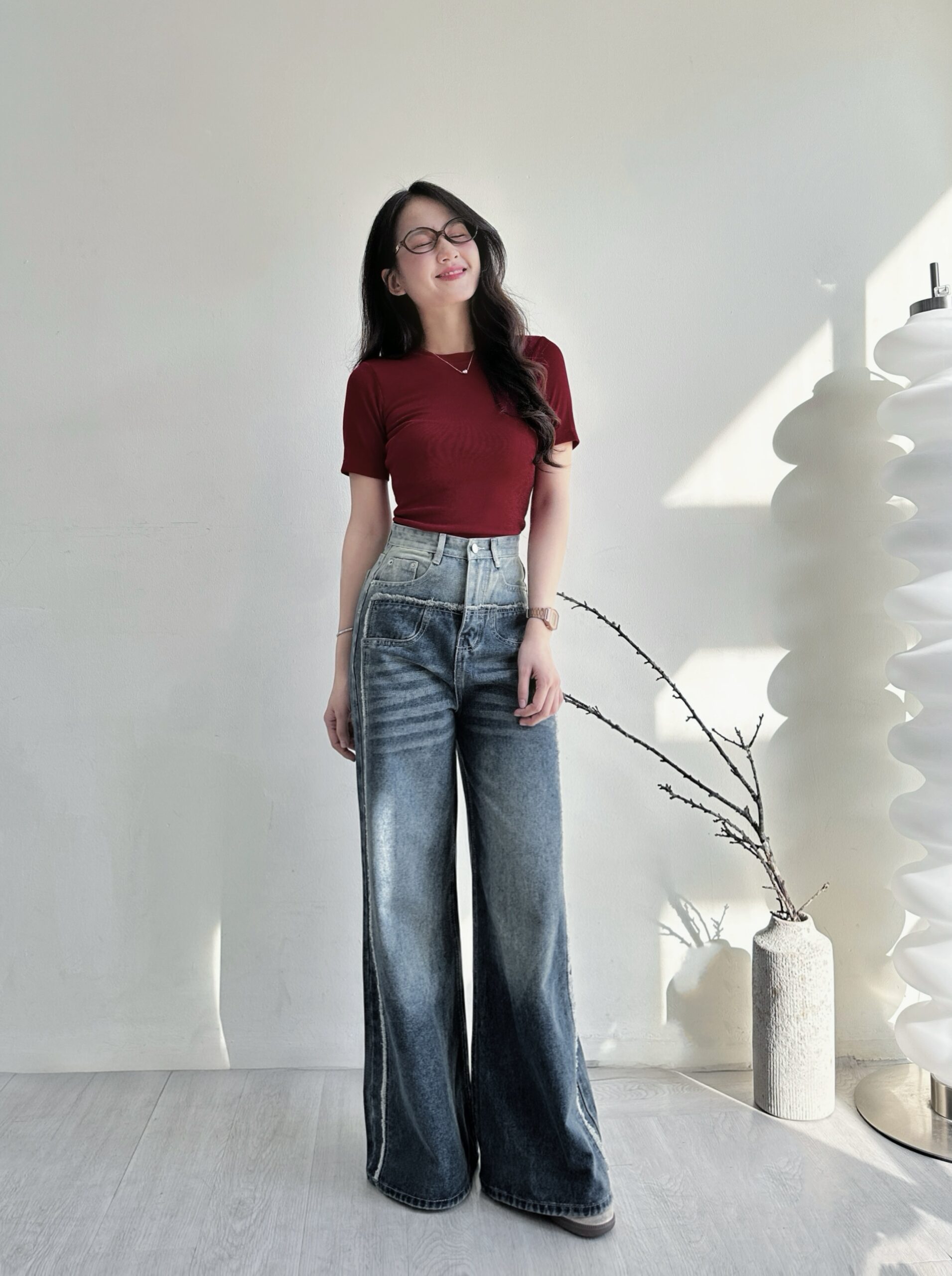 - Kiểu dáng: Quần jean ống suông rộng, lưng cao