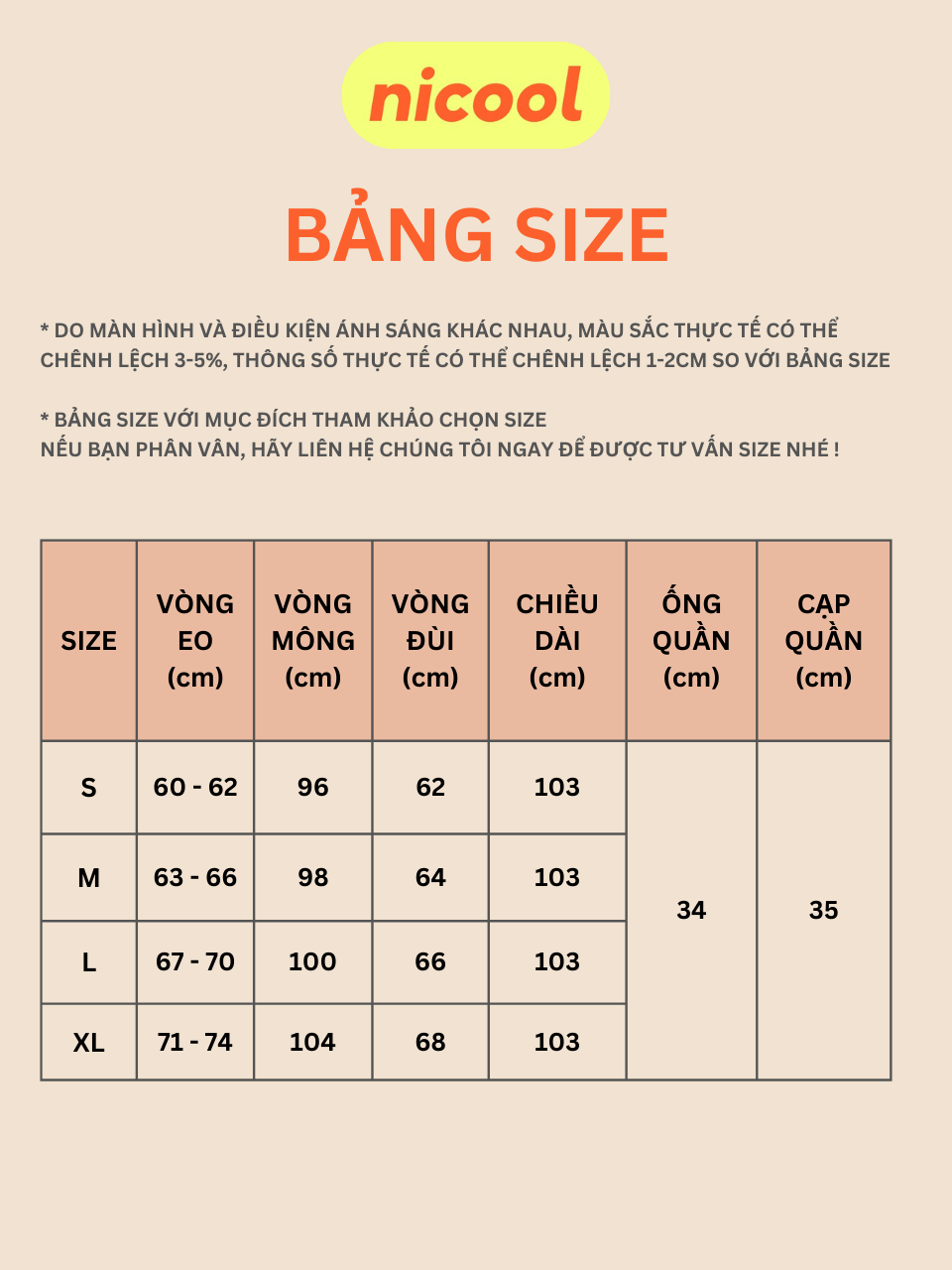 Lưu ý: Bảng size có thể có sai số 2-3cm tùy vào độ co giãn của vải. Còn phân vân? Liên hệ ngay với NICOOL để được tư vấn size chuẩn nhất!